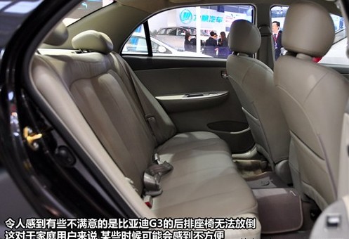 不過除了內(nèi)部做工值得肯定外,比亞迪G3也有不太令人滿意的地方。首先其車身外形的做工在某些細節(jié)上還略顯瑕疵,比如這輛展車的后備箱接縫明顯比合資車型要松散一點,而鈑金的精細程度也有可以提高的空間。最后有些令人感到意外的是比亞迪G3的后排座椅居然無法放倒,這對一款家用車型來說,也許會在日常使用時感到有些不便。