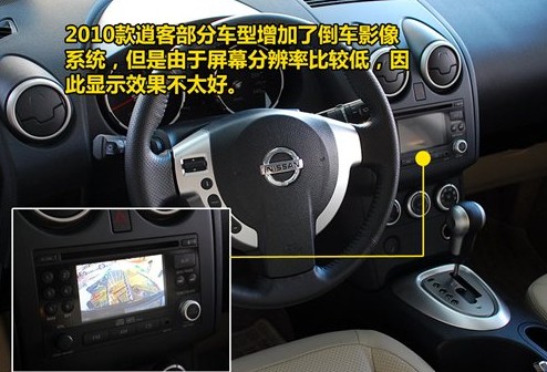 新的逍客在外觀上沒有任何變化,僅僅只在原來6款車身顏色的基礎上增加夢幻銀色。更多的變化出現(xiàn)在車輛內(nèi)部的配置上,部分車型增配了倒車影像系統(tǒng),但我們卻認為這個并不實用,因為屏幕只有4.3英寸,也就是和一般車載導航儀的大小相當,而且分辨率比較低,所以顯示效果不好。令人費解的還有,有了攝像頭之后,逍客卻沒有裝配倒車雷達,其實大家在倒車的時候,倒車影像只是作為參考,主要還是依靠倒車雷達的聲音來判斷距離遠近,所以沒有倒車雷達很不方便。