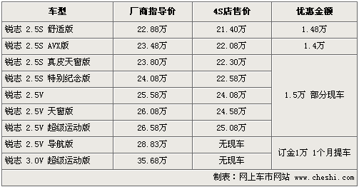 目前銳志的在價(jià)格優(yōu)惠方面基本和11月保持一致,其中入門(mén)級(jí)舒適版優(yōu)惠1.48萬(wàn),最低售價(jià)為21.40萬(wàn),2.5真皮版以及天窗版等優(yōu)惠1.5萬(wàn)元,部分店內(nèi)還推出了贈(zèng)送保險(xiǎn)等相應(yīng)活動(dòng)。而3.0排量一直沒(méi)有現(xiàn)車(chē)供應(yīng),還需要訂車(chē)。銳志全系車(chē)型較多,一般購(gòu)買(mǎi)車(chē)型主要集中在舒適版和紀(jì)念版,消費(fèi)者可根據(jù)需要選購(gòu)。