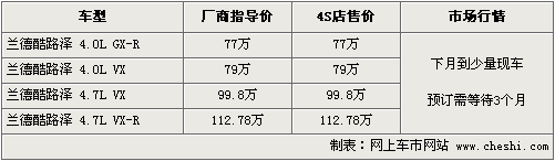 據(jù)4S店銷售人員介紹,蘭德酷路澤因價格較貴,均已訂單式銷售,所有車型需預訂,訂金為1萬元,需等待3個月左右時間。另據(jù)介紹,下月會有一臺白色頂配版現(xiàn)車到店。對此車感興趣的朋友可咨詢經銷商處,北京地區(qū)各4S店由于訂單不同,各店銷售的現(xiàn)車顏色有所不同。