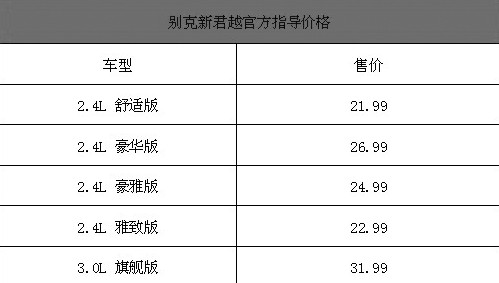 7月8日,別克君越換代車型新君越公布價(jià)格上市,價(jià)格從21.99-31.99萬(wàn)元區(qū)間,比我們之前預(yù)測(cè)的價(jià)格稍高一些,其中新君越頂配車型的售價(jià)超過30萬(wàn)元區(qū)間,以下是新君越各款車型官方指導(dǎo)價(jià)格:別克新君越官方指導(dǎo)價(jià)格
