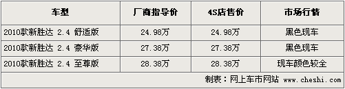 據(jù)現(xiàn)代汽車4S店銷售人員介紹,2010款新勝達(dá)目前至尊版現(xiàn)車較全,現(xiàn)車顏色有黑色、白色、銀色、藍(lán)色、銅色可供選擇,其余兩款車型有黑色現(xiàn)車供應(yīng),如需預(yù)訂其他顏色需交訂金1萬(wàn)元,等待15天左右可提到車。北京地區(qū)各4S店由于訂單不同,各店銷售的現(xiàn)車顏色有所不同。