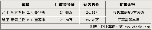 據(jù)進(jìn)口起亞4S店銷售人員介紹,新索蘭托訂單持續(xù)增加,如客戶著急提車,需在店內(nèi)加裝3萬(wàn)元裝飾,裝飾包括:腳墊、貼膜、地膠、封釉、加不銹鋼保險(xiǎn)杠等。預(yù)訂需要交納1萬(wàn)元訂金,6月份可提到現(xiàn)車,F(xiàn)車顏色根據(jù)近期到車顏色而定。