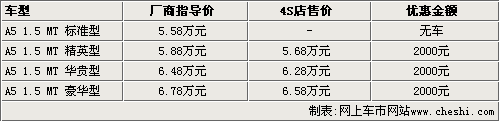 據(jù)奇瑞汽車(chē)4S店銷(xiāo)售人員介紹,目前奇瑞A5標(biāo)準(zhǔn)型由于配置太低,4S店內(nèi)無(wú)車(chē)銷(xiāo)售,其他三款車(chē)型現(xiàn)車(chē)都比較齊全。現(xiàn)在A5的優(yōu)惠幅度比元旦前要少,只能優(yōu)惠2000元,而且不能贈(zèng)送裝飾。