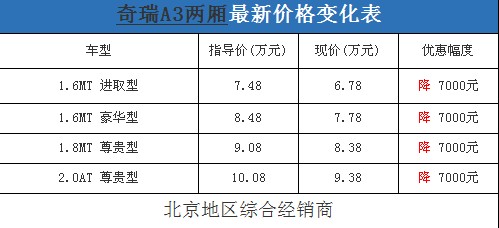 近日,編輯從北京地區(qū)綜合經(jīng)銷商處了解到,奇瑞A3的現(xiàn)車充足,顏色也比較齊全,提供給消費者的選擇空間較大;目前購買該車全系都可以優(yōu)惠7000元現(xiàn)金,與之前的降價幅度相比有了小幅度的提升,性價比很不錯。據(jù)經(jīng)銷商透露,消費者要想以這個價格購車,需要在店內(nèi)做一條龍服務,其中車輛四項基本險最低可以打7折(約合2500-3000元左右)。以下是奇瑞A3最新價格變化表: