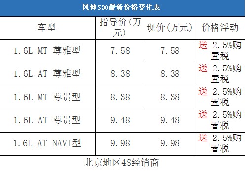 東風(fēng)風(fēng)神S30上市后,價格一直都比較穩(wěn)定,和競爭對手相比,風(fēng)神S30的價格優(yōu)勢并不是非常突出,因此市場表現(xiàn)也只能用一般來形容,其12月份不足5000輛的月銷量也從側(cè)面反映了這個問題。我們近日從北京地區(qū)的一家東風(fēng)風(fēng)神汽車4S經(jīng)銷商處了解到,目前該店正在舉行購車送2.5%購置稅的活動,相當(dāng)于有1500元以上的現(xiàn)金優(yōu)惠。以下是風(fēng)神S30全系車型最新報價表: