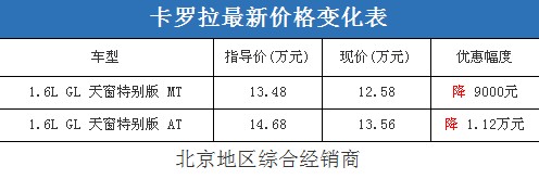 近日,編輯從北京地區(qū)綜合經(jīng)銷商處了解到,卡羅拉有1.6L特別版現(xiàn)車(銀色、黑色、紅色);目前購(gòu)車的優(yōu)惠幅度與09年末相比有了顯著提升,最高優(yōu)惠1.12萬元,性價(jià)比還不錯(cuò)。據(jù)經(jīng)銷商透露,消費(fèi)者要想以這個(gè)價(jià)格提車,需要在店內(nèi)做一條龍服務(wù),其中車輛保險(xiǎn)的折扣需要消費(fèi)者到店與銷售人員詳談才能夠確定。以下是卡羅拉最新價(jià)格變化表: