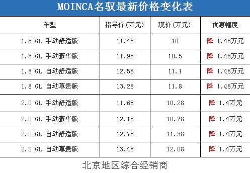 近日,編輯從北京地區(qū)綜合經(jīng)銷商處了解到,現(xiàn)代MOINCA名馭的現(xiàn)車比較充足,即使是冷門顏色車型,預(yù)定等待的時(shí)間也不會(huì)很久。據(jù)經(jīng)銷商透露,MOINCA名馭最高可以優(yōu)惠不到1.5萬元,并且會(huì)贈(zèng)送一些基本的汽車裝潢;但是消費(fèi)者要想以這個(gè)價(jià)格提車,需要在店內(nèi)做一條龍,其中車輛四項(xiàng)基本保險(xiǎn)可以打9.5折(約合4100-4600元左右)。以下是MOINCA名馭最新價(jià)格變化表: