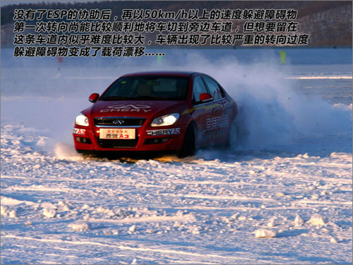 在整個(gè)避讓過程中,奇瑞A3底盤以及轉(zhuǎn)向均表現(xiàn)非常出色。尤其是四連桿后獨(dú)立懸架系統(tǒng),使得四輪的控制變得非常靈敏。但也不是完全沒有遺憾的地方,前文中我們就提到過了,A3的懸掛調(diào)校是完全尊重舒適性能的,所以在這種比較極限的動(dòng)作下,懸掛對(duì)于車身的支撐力度就明顯不夠了,最受力的懸掛被壓縮的非常明顯。不過,在ESP的幫助下,即便是在這種冰雪路面上,A3始終能緊緊跟上我的駕駛意圖,不斷地作出連續(xù)的轉(zhuǎn)向動(dòng)作,總體而言,奇瑞A3的操控性表現(xiàn)還是讓人滿意的。