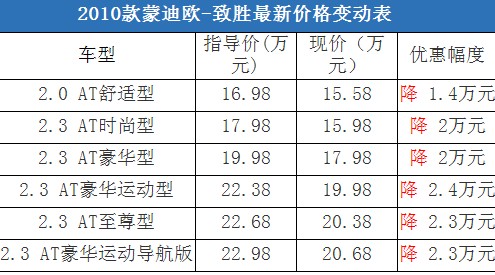 近日,編輯從長安福特北京綜合經(jīng)銷商處了解到,蒙迪歐-致勝的現(xiàn)車比較充足,目前購車最高可以優(yōu)惠2.4萬元現(xiàn)金,與去年末的降價(jià)幅度持平。據(jù)經(jīng)銷商透露,消費(fèi)者要想以這個(gè)價(jià)格提車,需要在店內(nèi)做購車一條龍服務(wù),其中車輛四項(xiàng)基本保險(xiǎn)的折扣為9折。以下是蒙迪歐-致勝最新價(jià)格變化表: