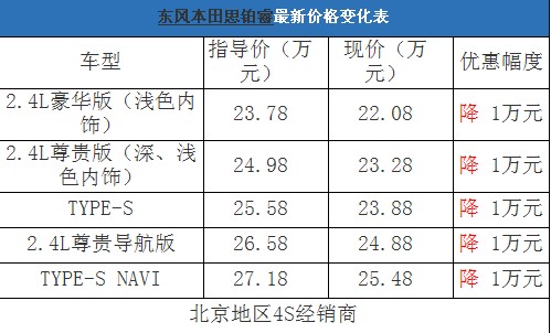 近日,編輯從北京地區(qū)東風本田4S經(jīng)銷商處了解到,目前思鉑睿在店內(nèi)有少量現(xiàn)車,購車全系可以優(yōu)惠1萬元現(xiàn)金。以下是思鉑睿最新價格變化表: