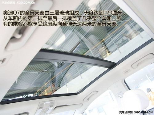 作為奧迪旗下的第一款SUV車型,奧迪理所當(dāng)然的為我們帶來了豪華的全景天窗配置。這個被稱為“Open Sky”的全景天窗,由三層玻璃組成,長度達(dá)到170厘米,從車廂內(nèi)的第一排至最后一排覆蓋了幾乎整個車廂,所有的乘客都能享受這扇縱向延伸長達(dá)兩米的全景天窗。
