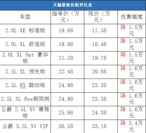 近日編輯從北京地區(qū)東風(fēng)日產(chǎn)4S經(jīng)銷商處了解到,天籟有少量黑色現(xiàn)車,部分車型預(yù)定需要等待20天到一個月左右就可以提車。據(jù)經(jīng)銷商透露,目前2.0L排量車型可以優(yōu)惠1.5萬元,2.5L排量車型可以優(yōu)惠1.6萬元,而最高配天籟可以優(yōu)惠3.4萬元,可見天籟2.5L排量車型的優(yōu)惠幅度與1月份相比有了4000元左右的縮減。以下是新天籟最新價格變化表: