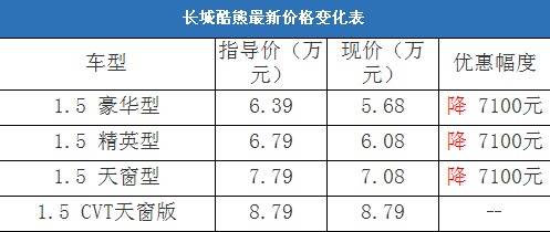 近日,編輯從長(zhǎng)城汽車4S經(jīng)銷商處了解到,酷熊前段時(shí)間購車送鉆石的促銷活動(dòng)已經(jīng)結(jié)束,目前在店內(nèi)購車沒有任何優(yōu)惠。相比之下,在綜合經(jīng)銷商處購車的消費(fèi)者可以享受7100元的現(xiàn)金優(yōu)惠。據(jù)經(jīng)銷商透露,酷熊的CVT版車型也可以預(yù)定,定金為2000元,等待15個(gè)工作日就可以提車,但是購車沒有任何優(yōu)惠。以下是長(zhǎng)城酷熊最新價(jià)格變化表: