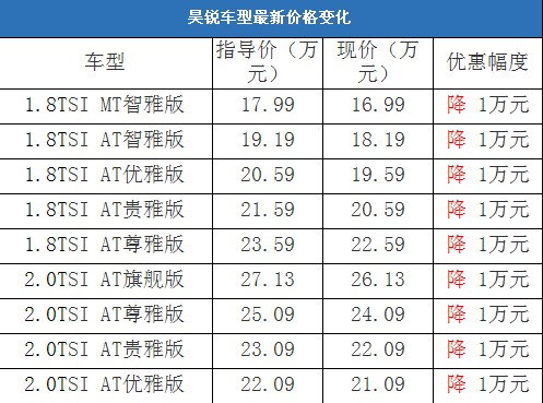 近日,編輯從北京地區(qū)上海大眾斯柯達(dá)4S經(jīng)銷商處了解到,昊銳有少量現(xiàn)車(紅色、灰色和黑色);目前購車可以優(yōu)惠1萬元,經(jīng)銷商透露消費(fèi)者到店詳談還會(huì)有更多優(yōu)惠。以下是昊銳最新價(jià)格變化表:
