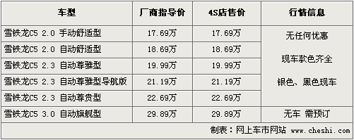 筆者從東風雪鐵龍經(jīng)銷商處了解到,目前C5全系有舒適版、尊雅版以及尊貴版現(xiàn)車供應,主要有銀色、黑色、藍色外觀可選,顏色不齊全,其他款需要預定,訂金為2000元-5000元。同時4S店提供2.3排量試駕車供消費者體驗。目前全系車型尚沒有出現(xiàn)優(yōu)惠幅度。
