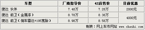 據(jù)4S店銷售人員介紹:目前捷達(dá)最高優(yōu)惠為4000元,各4S店內(nèi)現(xiàn)車較充足。目前到的車輛顏色有白色、銀色、灰色、黑色,基本上是捷達(dá)暢銷的顏色,喜歡的朋友請與4S店聯(lián)系。如購買非金屬漆車輛,譬如白色,可以在廠商指導(dǎo)價上減少2000元。如消費(fèi)者在店內(nèi)做保險等一條龍服務(wù),還可獲贈腳墊、滅火器。