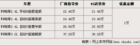 據(jù)經(jīng)銷商銷售人員介紹,消費(fèi)者于近期購買雪佛蘭-科帕奇任意一款車型,可以得到1萬元的現(xiàn)金優(yōu)惠,2.4L排量高配的七座手自一體豪華版經(jīng)優(yōu)惠后售價(jià)為25.58萬元,而低一級的2.4L手動(dòng)五座舒適版經(jīng)優(yōu)惠后售價(jià)降為21.48萬元。頂級的3.2L自動(dòng)7座旗艦版經(jīng)優(yōu)惠后,售價(jià)從37.28萬元下降到了36.28萬元。