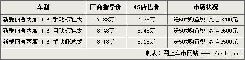 東風(fēng)雪鐵龍愛麗舍從9月份開始,對車型進(jìn)行了一次全面升級。2010款新愛麗舍在安全、舒適、節(jié)油和性能方面比老款有增加了相應(yīng)的配置,進(jìn)一步強(qiáng)化了新愛麗舍成熟的產(chǎn)品品質(zhì)。而09款兩廂愛麗舍更具城市便利性,其備箱空間絲毫不亞于三廂車型,是繼富康后的又一經(jīng)典兩廂叫用車。根據(jù)網(wǎng)上車市價格監(jiān)測系統(tǒng)顯示,目前購買愛麗舍兩廂,可享受購置稅減半,折合最高優(yōu)惠約3600元。具體車型價格行情如下: