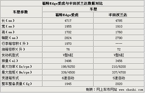 由于2011款Edge銳界并沒有公布官方數(shù)據(jù)及價格,我們只好利用它的上代車型Edge愛虎做個比較,看看它的競爭對手到底是誰?從上表顯示的數(shù)據(jù)表明,Edge愛虎與國內(nèi)市場上銷售的豐田漢蘭達有非常相似之處。無論車身尺寸還是發(fā)動機配備,都有著明顯的競爭關系。由于漢蘭達的設計年份比愛虎更晚,所以在車身長度及車高方面占據(jù)一定優(yōu)勢屬于正常現(xiàn)象。兩者且相同配備3.5L V6引擎,只是在變速箱選擇上有所不同。如果單方面從變速箱擋位數(shù)上看,愛虎要比漢蘭達更先進。