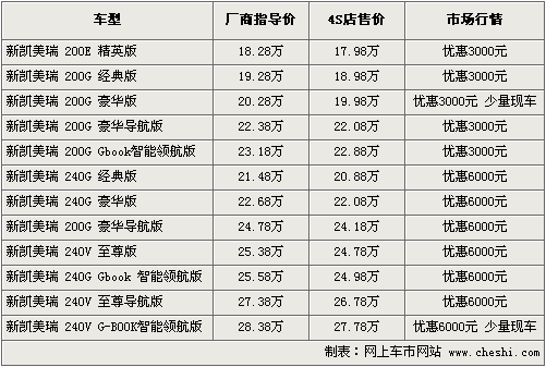 2010款凱美瑞于2010年3月1日在深圳正式上市,售價(jià)相較于09款有所調(diào)整,多款車型價(jià)格進(jìn)行了官方下調(diào)。售價(jià)區(qū)間為18.28-28.38 萬元。根據(jù)網(wǎng)上車市價(jià)格監(jiān)測系統(tǒng)顯示,目前2010款凱美瑞上市不到一個(gè)月就已經(jīng)開始出現(xiàn)優(yōu)惠,最高降幅達(dá)6000元。具體車型售價(jià)見下表: