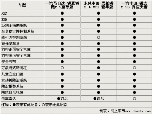 隨著汽車市場(chǎng)的日益成熟,安全能力逐漸也成為了車主最為關(guān)心的問題?梢钥闯鯝BS+EBD和6安全氣囊均成為了這三款車型的標(biāo)準(zhǔn)配置。但仔細(xì)看下來,睿翼轎跑和思鉑睿的配置還是更加的全面,在配備后倒車?yán)走_(dá)同時(shí)還配備了前部停車?yán)走_(dá),,進(jìn)一步保證停車時(shí)的安全。值得一提的是這三款車型都配備了車輛行駛動(dòng)態(tài)控制系統(tǒng),該項(xiàng)配置可以大大的降低車輛行駛中,因側(cè)滑而發(fā)生的事故,尤其是睿翼轎跑和銳志還配備了牽引力控制系統(tǒng)。在細(xì)節(jié)方面三款車同樣十分到位,都配備的后排兒童安全門鎖、防眩目后視鏡等。