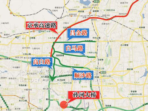 (四)由京密路方向進(jìn)京的車輛,可分別由牛欄山路口繞行昌金路;由馬坡橋繞行白馬路;由西杜蘭路口繞行順沙路。