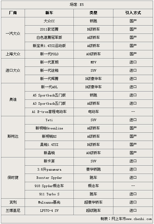 在本屆北京車展的E5館,一共有9家廠商再次館中布展,除了布加迪沒有新車之外,其他8家廠商均帶來了新車型與消費(fèi)者們見面。一汽大眾帶來了備受矚目的國產(chǎn)版大眾CC以及新寶來1.4TSI等4款新車型,上海大眾則帶來了新一代的A0級小車POLO參展,進(jìn)口大眾為大家?guī)砹诵乱淮句J、新一代輝騰等3款新車型,斯柯達(dá)也為大家?guī)砹耸卓頢UV產(chǎn)品Yeti等新車型,新A8L也在奧迪的新車隊(duì)列中;超跑品牌出現(xiàn)在了E5展館,保時捷為大家?guī)砹?18 Spyter概念車以及價格門檻更低的3.6升panamera等新車型,賓利以及蘭博基尼也為大家?guī)砹烁雍廊A以及速度更快的新車。