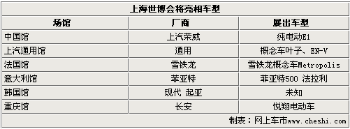 在本次世博會(huì)上,中國(guó)館中將展出上汽榮威推出的純電動(dòng)車E1,這款車在本屆北京車展中已經(jīng)正式亮相,預(yù)計(jì)將在2012年正式實(shí)現(xiàn)量產(chǎn)。在通用館展出的EN-V日前已在上海以全球首發(fā)的身份亮相,由于造型不同他們分別被命名為“驕”、“妙”和“笑”。這款雙人座EN-V電動(dòng)聯(lián)網(wǎng)車創(chuàng)新地融合了電氣化和車聯(lián)網(wǎng)兩大技術(shù),從而實(shí)現(xiàn)未來(lái)城市交通零油耗、零排放、零堵塞和零事故。其余將亮相的車型還包括雪鐵龍全新概念車Metropolis、菲亞特500、法拉利和長(zhǎng)安悅翔電動(dòng)車等。
