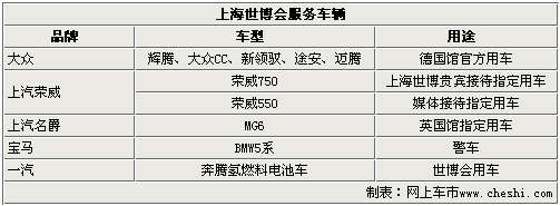 除了在展館內(nèi)展出的新車,各大汽車廠商也對(duì)組委會(huì)和場(chǎng)館提供了服務(wù)用車。自2008年成為北京奧運(yùn)會(huì)官方用車合作伙伴之后,大眾汽車在即將開幕的2010年上海世博會(huì)中,成為德國(guó)國(guó)家館官方用車合作伙伴,將頂級(jí)豪華轎車輝騰等6輛官方用車正式交付給上海世博會(huì)德國(guó)國(guó)家館。上汽榮威旗下的榮威750和550則成為了世博會(huì)貴賓指定用車和媒體制定用車。寶馬公司則提供的22輛530Li轎車將納入交警總隊(duì)警務(wù)開道車隊(duì),為世博會(huì)期間迎送貴賓擔(dān)負(fù)起安全保障工作。
