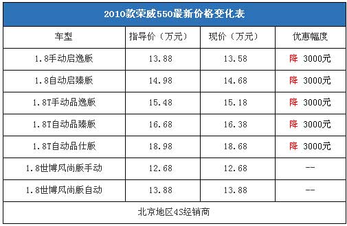 近日,編輯從北京地區(qū)上汽汽車4S經(jīng)銷商處了解到,榮威550全系車型的現(xiàn)車比較充足,購車可以優(yōu)惠3000元左右。據(jù)經(jīng)銷商介紹,在春節(jié)期間推出的榮威550賀歲版在世博會到來之際改名為“世博風(fēng)尚版”繼續(xù)銷售,因為賀歲版車型的性價比較高,沒有大幅度的現(xiàn)金優(yōu)惠。店內(nèi)銷售人員介紹,如果不需要現(xiàn)金優(yōu)惠,消費者在店內(nèi)可獲贈世博版大禮包,有機會免費參加上海世博會。