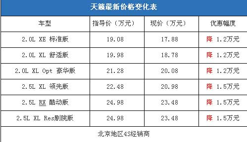 近日我們從東風日產北京海潤嘉4S經銷商處了解到,天籟的現(xiàn)車充足,顏色也比較全,不過以銀色和黑色為主。如果部分車型需要預定,等待的時間為1個月左右,定金為2000元。目前2.0L排量車型可以優(yōu)惠1.2萬元,2.5L排量車型可以優(yōu)惠1.5萬元。