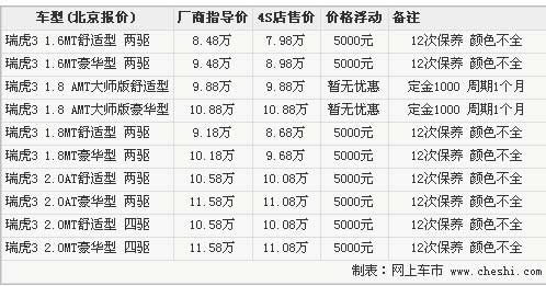由于瑞虎大師版車型剛剛上市,4S店還沒有現(xiàn)車銷售,消費(fèi)者如果想預(yù)訂此車型需要交納1000元定金,預(yù)計(jì)提車周期在1個(gè)月左右。雖然大師版沒有現(xiàn)車也暫無優(yōu)惠,但是4S店表示現(xiàn)在購買瑞虎3的其他車型,可享受4000元現(xiàn)金優(yōu)惠,還可以贈(zèng)送一些裝飾,目前車型顏色并不齊全,白色均無現(xiàn)車需要預(yù)定。