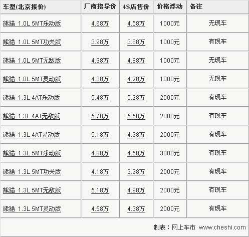 作為全球鷹旗下首款產(chǎn)品,吉利熊貓自上市以來就廣受年輕消費(fèi)者的關(guān)注。很多消費(fèi)者不難看出,吉利熊貓時尚靚麗的外形,與憨態(tài)可掬的熊貓非常相似,給整車帶來很多可愛的元素,符合時下年輕消費(fèi)者的購車需求。網(wǎng)上車市近期走訪北京地區(qū)吉利4S店,了解到了吉利熊貓最新的市場信息,具體情況請參考下表: