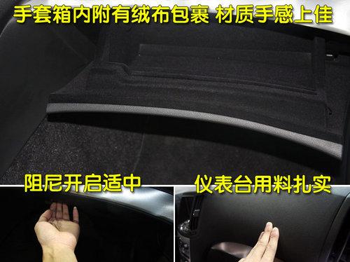儀表臺(tái)采用軟性塑料材質(zhì),手感舒適,用料比較扎實(shí)。副駕駛席手套箱采用阻尼設(shè)計(jì),整體開合力度適中。內(nèi)部附有絨布,做工手感一流。但儲(chǔ)物能力一般,只可放入一些小的物品。