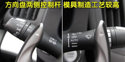 方向盤兩側(cè)的燈光、雨刷控制桿模具非常精細(xì),做工細(xì)致,實(shí)際使用當(dāng)中搬動(dòng)及轉(zhuǎn)動(dòng)兩側(cè)開關(guān)均無松垮的感覺。
