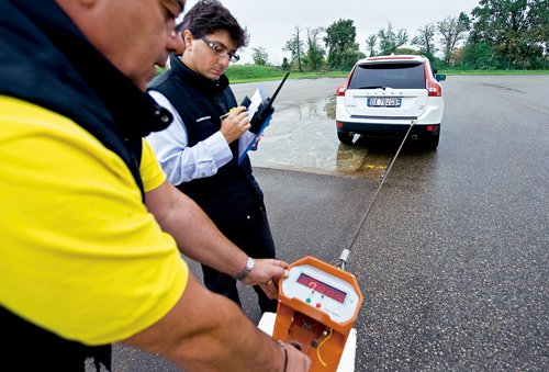 這一測(cè)試的目的在于測(cè)量車輛的牽引力,我們要使用一個(gè)十分精確的測(cè)量范圍達(dá)數(shù)千千克的測(cè)力計(jì)。正如在照片中看到的,車輛的四個(gè)輪子都在濕滑的大理石上,我們?cè)谏厦嬲f過,其附著力與在冰面上差不多。測(cè)力計(jì)的一邊通過一條鋼索與車體相連,另一邊固定在一個(gè)位置上。測(cè)試員啟動(dòng)汽車把鋼索拉直,然后繼續(xù)加油直到車輪開始打滑,這時(shí)很多因素都要考慮,包括發(fā)動(dòng)機(jī)功率、車的重量、輪胎的合成材料等,這些都是重要的參考數(shù)據(jù)。四驅(qū)車比兩驅(qū)車明顯占據(jù)上風(fēng),特別是XC60,其四驅(qū)版的牽引力比兩驅(qū)版高出了74%。Kuga兩個(gè)版本的差距為41%,略微小些。需要說明的是,正像前面說過的,沃爾沃兩款車的功率相差30馬力,其他方面沒有大的差別。在主要測(cè)試結(jié)束后,我們換了個(gè)地點(diǎn)重復(fù)剛才的測(cè)試,不是四個(gè)輪子都在大理石上,而是兩個(gè)在大理石上,兩個(gè)在瀝青上,仍然為濕滑路面。這也是為了測(cè)試防滑系統(tǒng)的功效,這時(shí)需要差速器的機(jī)械鎖止裝置發(fā)揮作用,Kuga和XC60上都沒有這一裝置。兩個(gè)輪子在瀝青上增加了附著力,可以看到測(cè)力計(jì)上顯示的數(shù)字與上次相比四輛車都增大了。福特兩驅(qū)車牽引力為602千克,四驅(qū)為820千克;沃爾沃兩款車的差距還是那么大,兩驅(qū)為710千克,四驅(qū)為1050千克。
