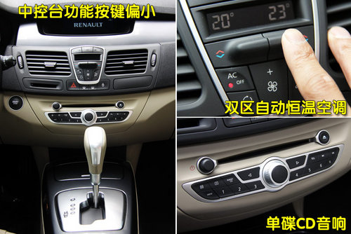 中控臺(tái)中細(xì)小的按鍵不知道法國(guó)人何時(shí)能夠?yàn)榇烁淖円幌,想?dāng)初進(jìn)入到C5車內(nèi)時(shí),被琳瑯滿目的小按鍵搞的暈頭轉(zhuǎn)向,并且在駕駛時(shí)我是不敢隨意去觸碰那個(gè)區(qū)域的。不過(guò)還好拉古那中控臺(tái)按鍵并不是很多,空調(diào)區(qū)域的造型很時(shí)尚,也很節(jié)省空間,實(shí)際操作也非常容易上手,調(diào)節(jié)方式也很簡(jiǎn)便。另外老款的拉古那配備的是多碟CD,而新款車型裝配的則是單碟CD音響,在日常使用中,多少會(huì)有一些不便。