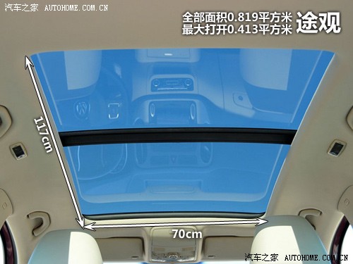途觀的天窗和大眾以往其他的電動(dòng)天窗秉承一樣的設(shè)計(jì),一鍵式開啟時(shí),天窗并不能一直打開到底,這個(gè)時(shí)候打開的長度大概為46cm,再擰一下旋鈕,天窗會(huì)繼續(xù)向后打開,此時(shí)打開的長度為59cm,全部可打開的面積達(dá)到0.413平方米。此外,在打開方式中還有一種換氣模式,跟前面說過的Q5一樣,前天窗會(huì)翹起,形成一個(gè)開口,用來起到換氣的作用,只是看起來比較窄而已。