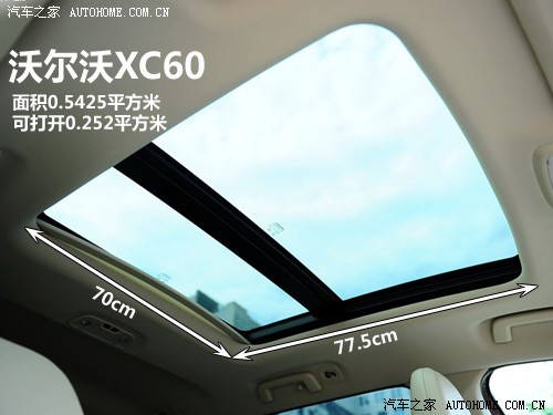 XC60的天窗為整體式,但是面積和Q5比起來就要明顯小很多,它的整體面積為0.797平米,可以打開的縱向長度不大,為36cm,可打開的面積為0.252平米。可以看到,從這個可打開面積上看,比前面的Q5和GLK都明顯要差。坐在后排的話,天窗能延伸的位置僅到后排乘客面前一些位置。