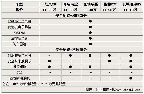 安全方面5款車都做得還算到位,前排雙安全氣囊只有X8沒(méi)有全部提供,而發(fā)動(dòng)機(jī)電子防盜、ABS+EBD、后排安全帶、到車?yán)走_(dá)這些日趨普及的安全措施,5款車全部配備。剛剛上市的哈弗H5還配備了一項(xiàng)區(qū)別于其他車型新功能-碰撞斷油系統(tǒng),通過(guò)名字我們就可以知道它的主要作用是什么。