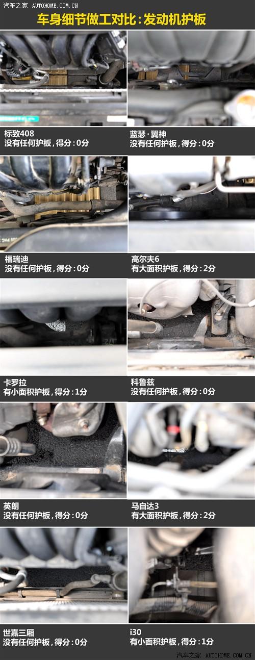 在發(fā)動(dòng)機(jī)護(hù)板這方面,高爾夫6和進(jìn)口馬自達(dá)兩廂有大面積的發(fā)動(dòng)機(jī)護(hù)板,能夠起到一定的保護(hù)作用,i30和卡羅拉有小面積的護(hù)板,而其他6款車型則沒有任何護(hù)板。