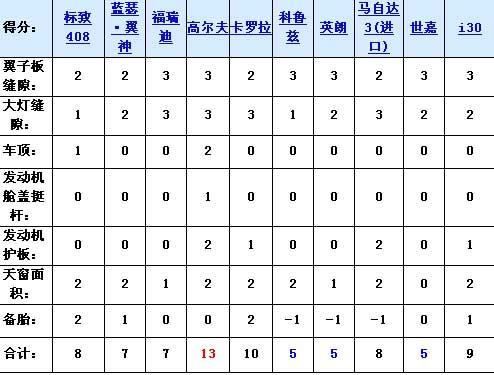 不難看出,標(biāo)致408雖然夠大,但他的做工和細(xì)節(jié)并不像看上去那么精細(xì),在10款緊湊型車中僅僅處于中等水平;藍(lán)瑟·翼神各方面中規(guī)中矩,沒有突出的亮點(diǎn);福瑞迪的外觀縫隙控制最出色,但天窗面積和備胎令人不爽;身材最小的高爾夫6因?yàn)榫哂芯?xì)的外部做工,大面積的天窗和發(fā)動機(jī)護(hù)板而在外觀方面有一定的優(yōu)勢,同時(shí)他的外觀也是十分招人待見的,只不過不停的減配令人很不爽;卡羅拉中庸但沒有明顯的短板,所以得分也不低;來自于通用集團(tuán)的科魯茲和英朗存在同樣的問題:大燈縫隙有點(diǎn)大,小備胎令人很很懊惱;進(jìn)口馬自達(dá)3如果不是因?yàn)樾涮サ脑,那么成績也不錯;世嘉除了縫隙控制得還可以以外,其他方面沒有任何亮點(diǎn);i30的表現(xiàn)卻比想象中強(qiáng)大,各方面均衡,成績僅次于卡羅拉。
