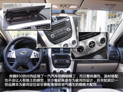 正如開始說的,一汽汽車制造真的是一個噱頭,因為一汽所出品的轎車一般做工都非常精細,這是絕大部分一汽汽車用戶所承認的,而且畢竟是一款更趨向于年輕人的緊湊型轎車,所以B50并沒有使用桃木內(nèi)飾裝扮,配合鍍鉻的配飾,其內(nèi)部看起來更加的年輕。