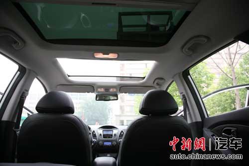 圖注:雙天窗可能是這ix35上最奢華的配置。若不是有那道支撐車體強(qiáng)度的橫梁擋在中間,就是真正的全景天窗了。不過即使這樣,前半部54cm×72cm的開啟面積已然足夠大了。