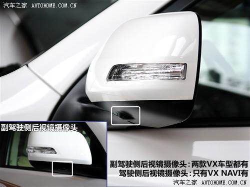 配置上的區(qū)別首先在前臉格柵就能發(fā)現(xiàn),因為在車標(biāo)下面隱藏了一個攝像頭,而這在低配車型上是沒有的,與之搭配的是正副駕駛后視鏡下面和車輛尾部也各有一個攝像頭,四個攝像頭組成了VX NAVI車型的“MTM多地形選擇功能監(jiān)視系統(tǒng)”。VX車型則沒有正駕駛后視鏡上的攝像頭。