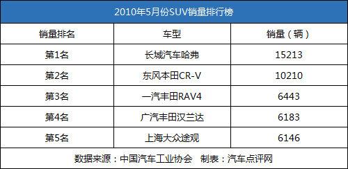 而其中最讓人欣慰的,還是SUV市場(chǎng),5月份共銷售10.31萬(wàn)輛,環(huán)比下降0.84%,同比增長(zhǎng)1.1倍。我們不妨來(lái)看看銷量榜上的SUV前五名,他們占據(jù)了SUV總銷量的43%,可以說(shuō)購(gòu)買SUV的近一半消費(fèi)者都選擇的是這5款車。