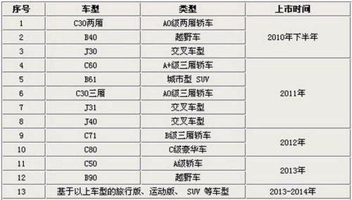 根據(jù)規(guī)劃,在2010-2014年的五年內(nèi),將會(huì)陸續(xù)推出共計(jì)20款全新車型,不過目前已經(jīng)曝光的是12款新車,其中在2010年內(nèi)有3款新車下線,而2011年將推出5款新車,2012年將推出基于薩博平臺(tái)的C71、C80兩款豪華車,2013年比較引人注目的是酷似攬勝的B90將推出。