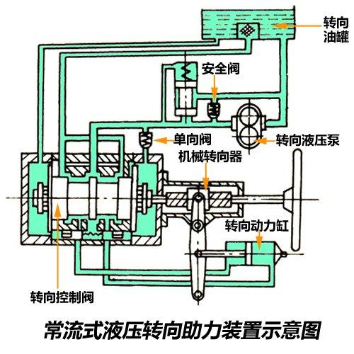 機(jī)械液壓助力系統(tǒng)的主要組成部分有液壓泵、油管、壓力流體控制閥、V型傳動(dòng)皮帶、儲(chǔ)油罐等等。這種助力方式是將一部分發(fā)動(dòng)機(jī)動(dòng)力輸出轉(zhuǎn)化成液壓泵壓力,對(duì)轉(zhuǎn)向系統(tǒng)施加輔助作用力,從而使輪胎轉(zhuǎn)向。