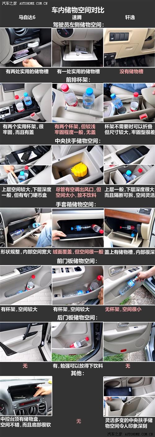 在這方面,速騰僅有的優(yōu)勢在于后門板上有儲物槽,而且能放得下飲料瓶,其他方面因?yàn)槌叽缱钚∷砸矝]什么亮點(diǎn),特別是前排中央扶手內(nèi)的空間太小,幾乎沒什么使用價(jià)值;馬自達(dá)6的表現(xiàn)中規(guī)中矩,沒有花哨的設(shè)計(jì),但也不乏亮點(diǎn),比如中控臺頂部的儲物槽;軒逸的亮點(diǎn)是靈活而且寬大的前排儲物空間,以及非常深的副駕駛手套箱。